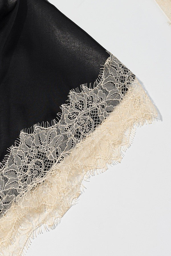 BEAUTIFUL LACE PATCHWORK MINI DRESS HIGH RUFFLED NECKLINE AND LONG FLARED BELL SLEEVES WITH RUFFLED CUFFS SATIN SLIP DRESS LAYERED OVER LACE TOP