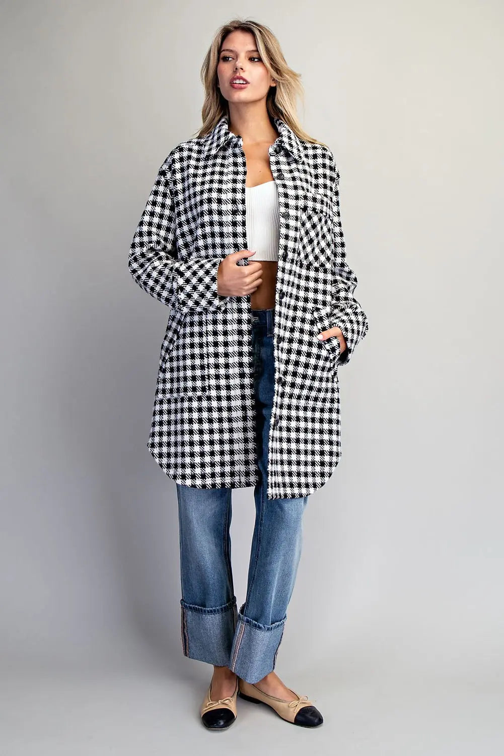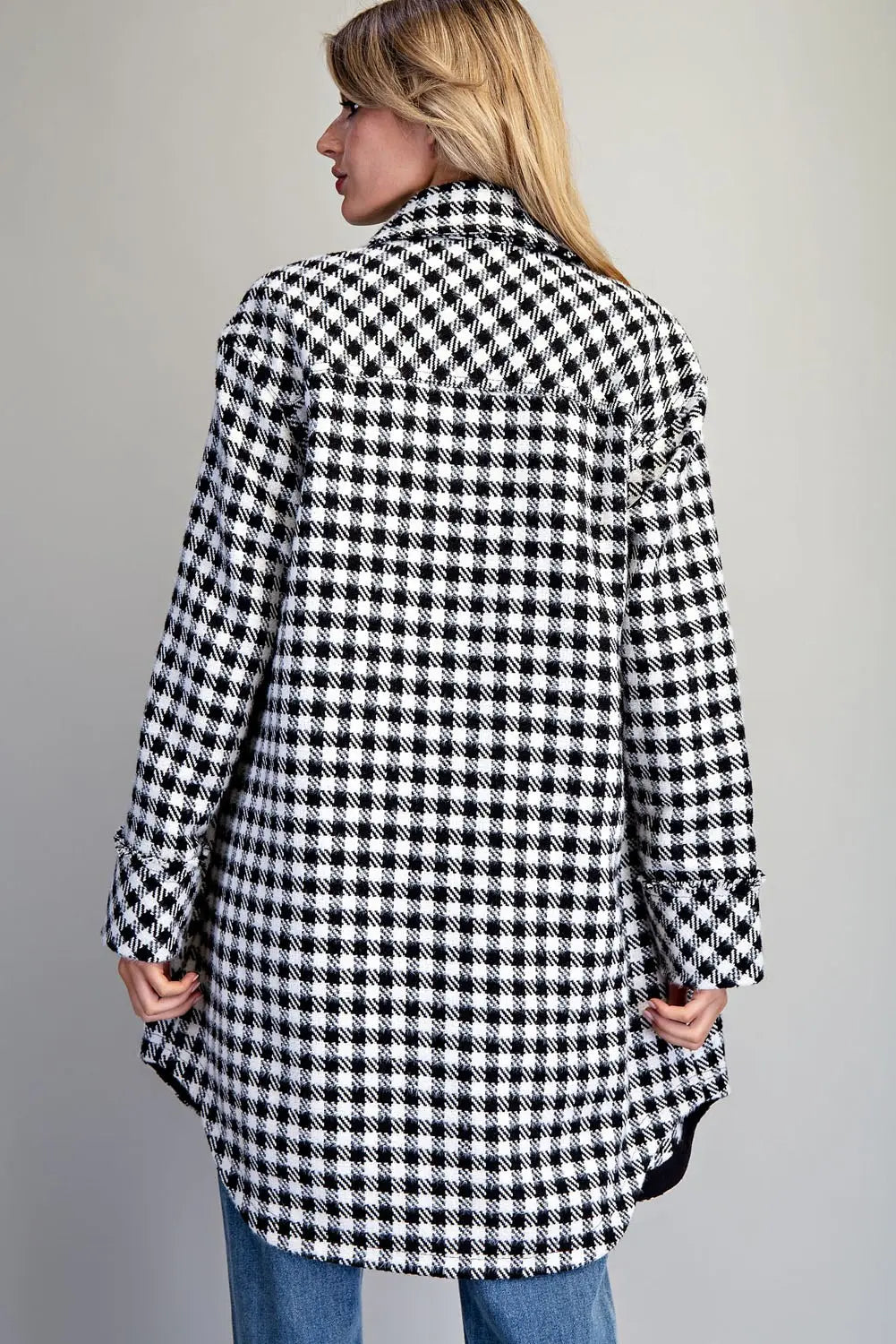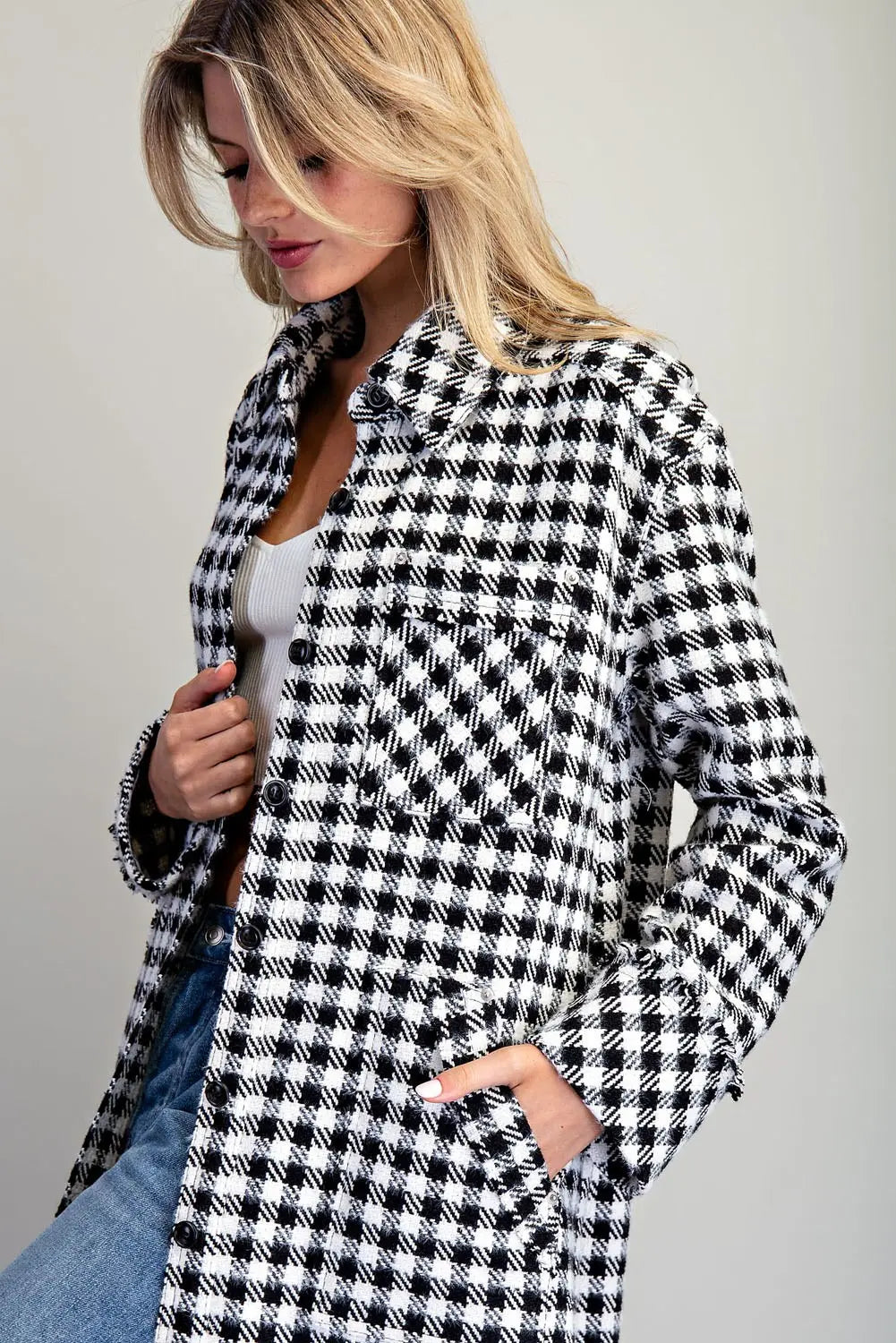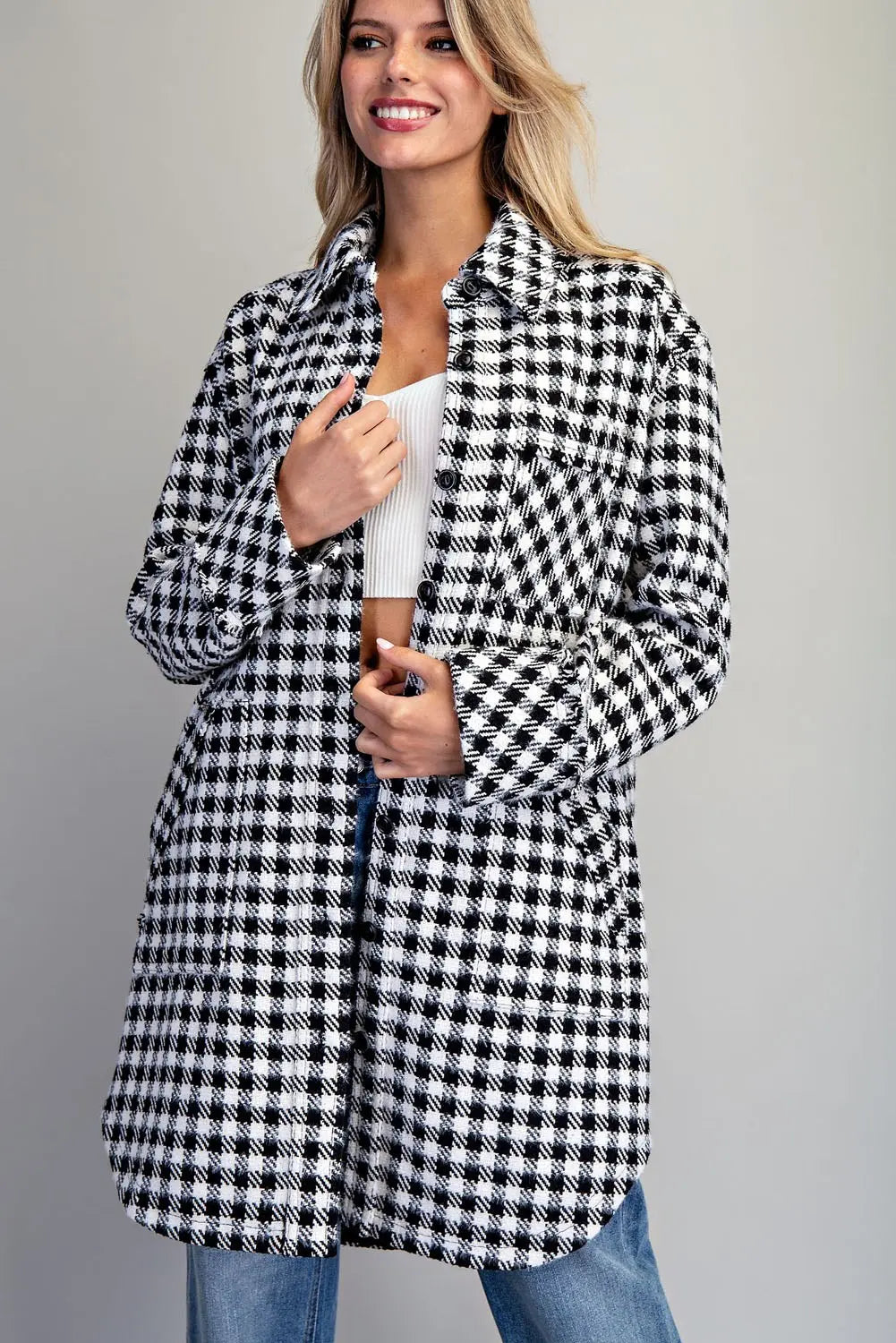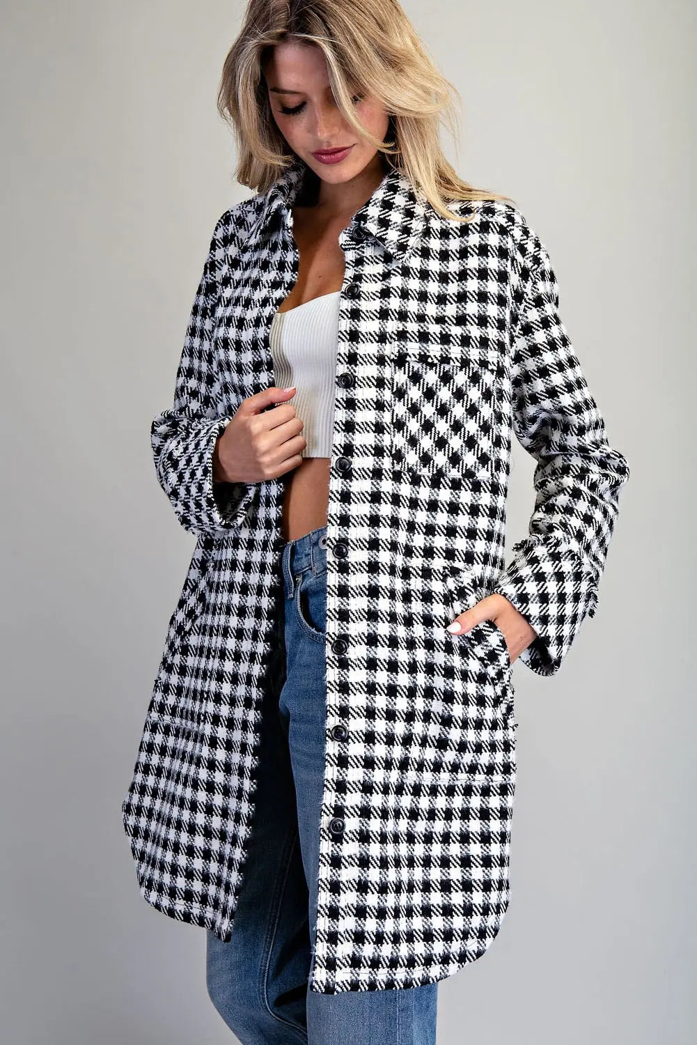 This longline jacket features a black and white gingham check with alternating striped squares that create a subtle houndstooth effect, designed with a collared neckline, button front closure, a single chest pocket, side welt pockets, and a curved hem for effortless layering.
