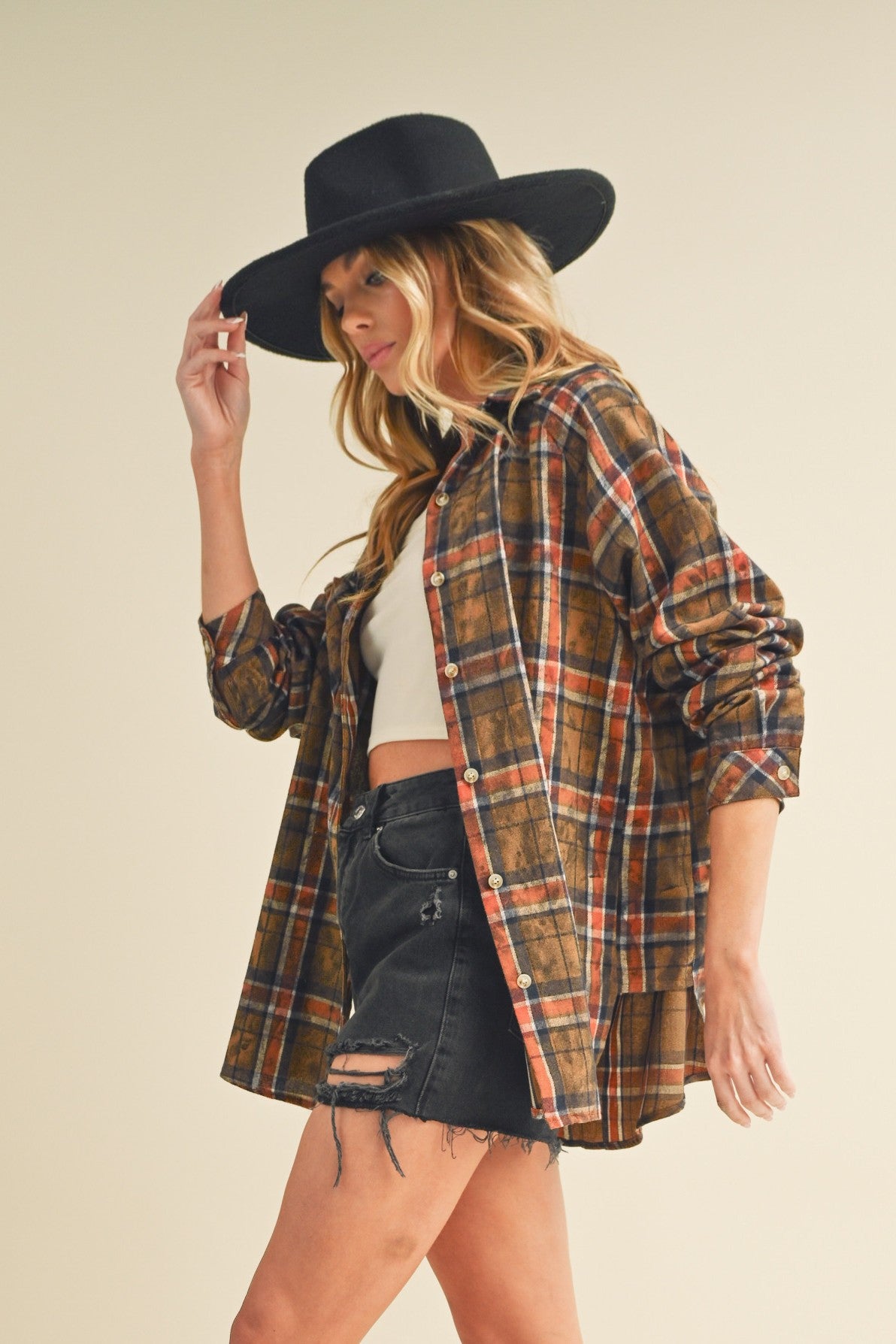 Drape yourself in warmth and style with Laura crafted from washed plaid flannel fabric the boxy silhouette exudes casual comfort, complemented by a modern side step hem.