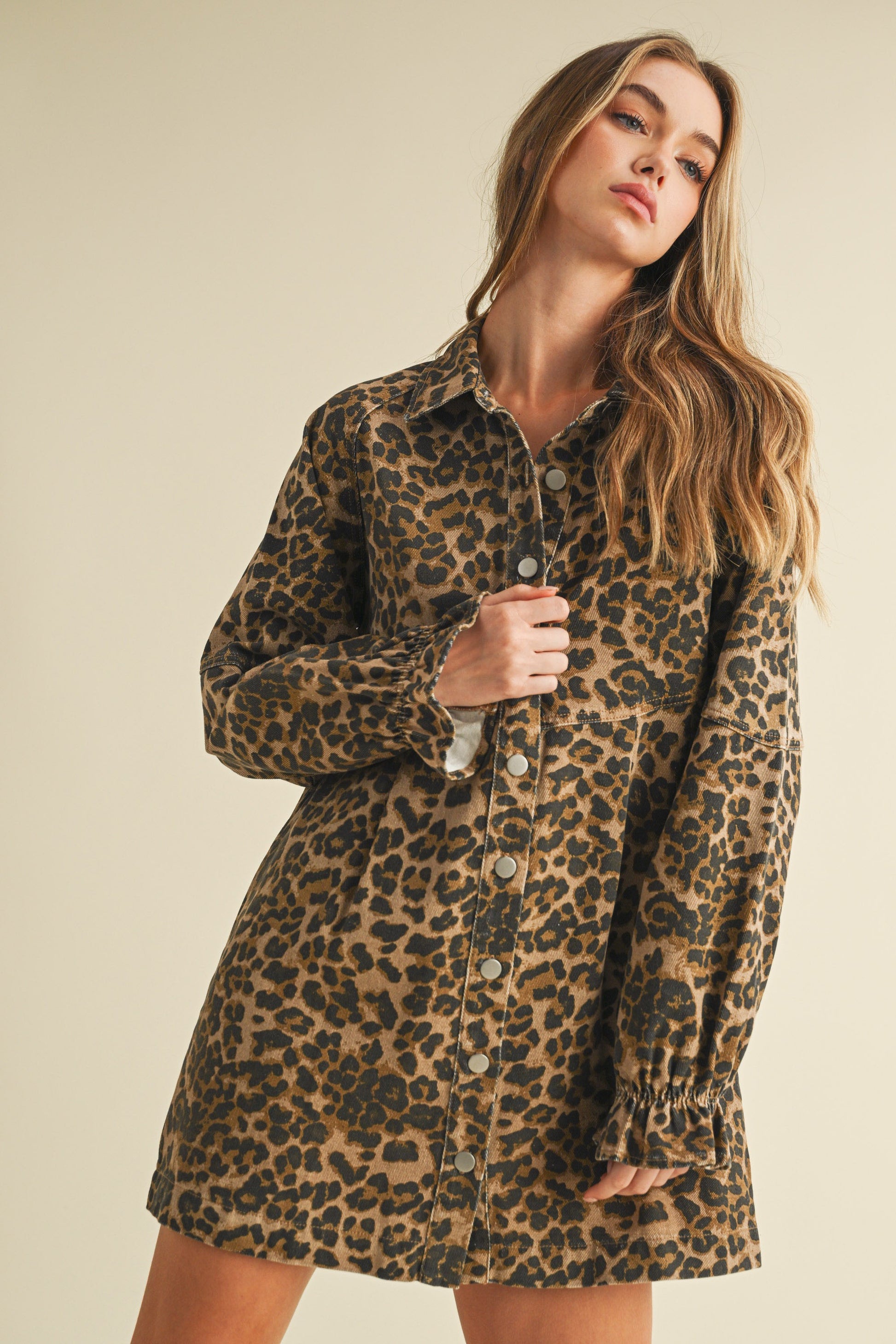LEOPARD PRINT BUTTON LONG SLEEVE DENIM DRESS