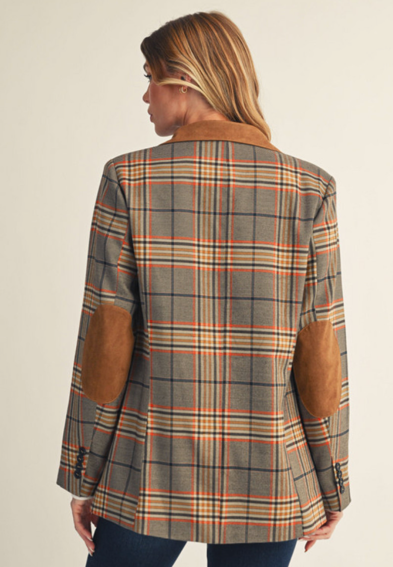 Long sleeves plaid blazer with suede contrast collar & elbow patch