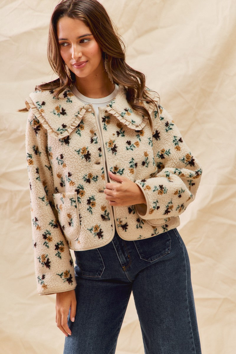 COLLARED BUTTON DOWN FLORAL BOHO SHERPA JACKET