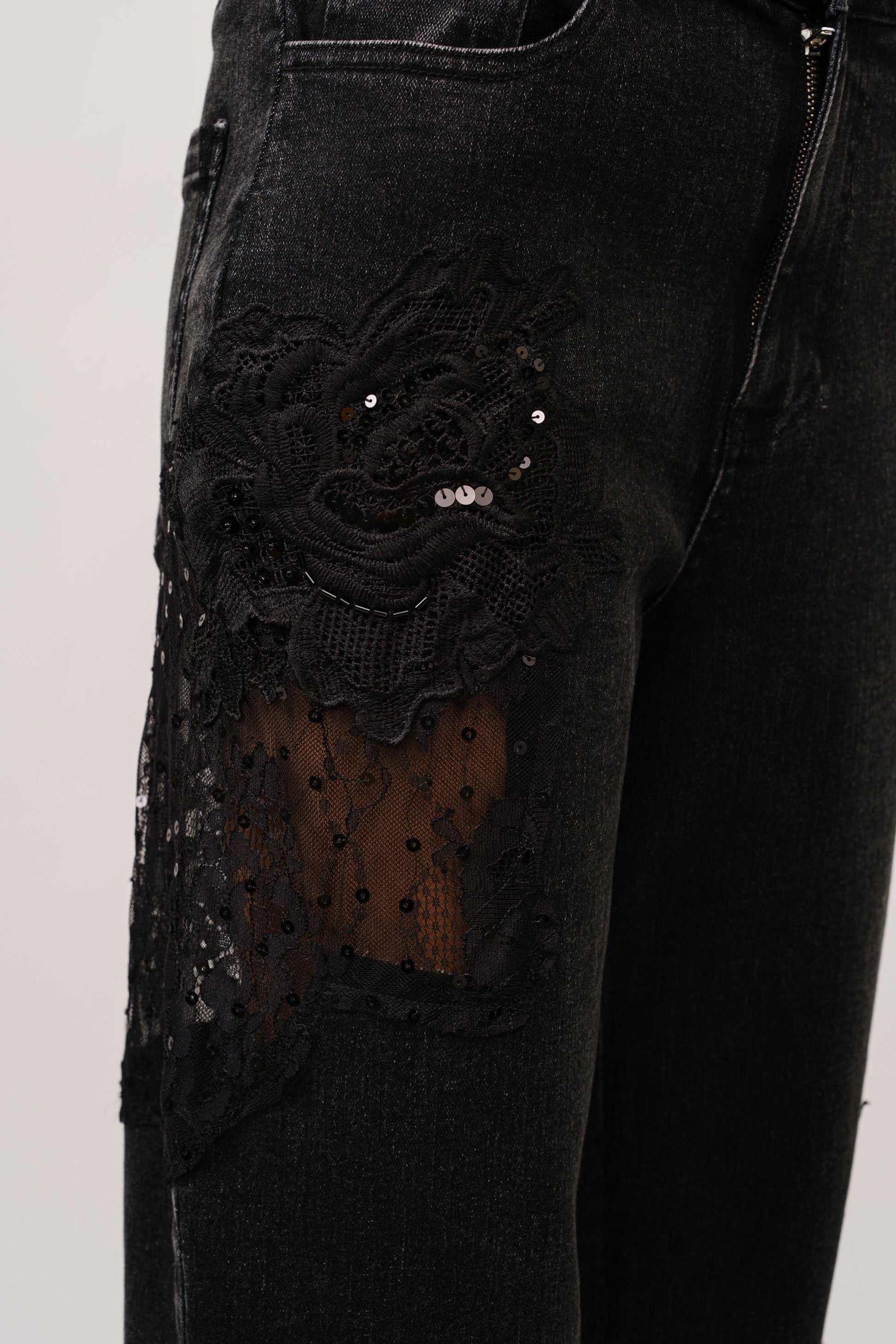 Mid-rise black denim jeans featuring lace floral patchwork and subtle embellishments. Designed with a straight-leg silhouette and slight stretch for comfort.