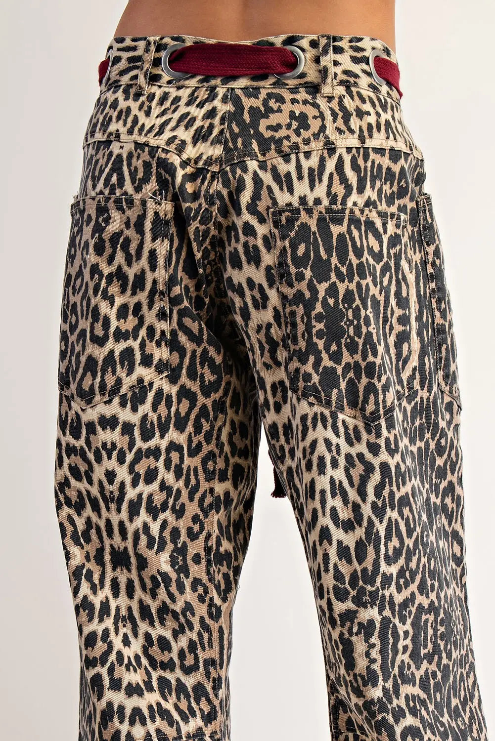 Mineral washed leopard print pants showcase a barrel leg silhouette